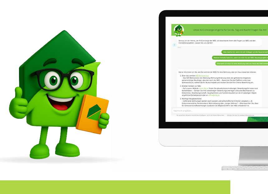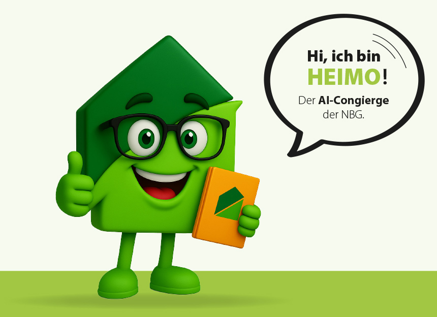 Heimo, der „Heimische“ – der Name steht bewusst für Nähe, Verlässlichkeit und Zuhause. HEIMO versteht sich als digitaler Mitarbeiter der NBG und als erste Anlaufstelle für Fragen rund ums Wohnen, Bauen und Verwalten.